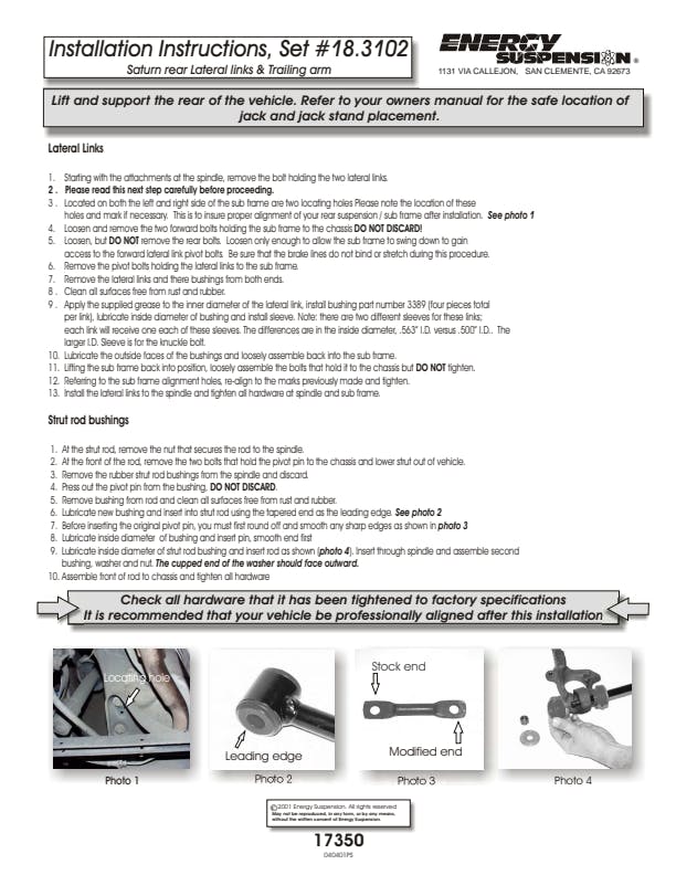 For both front and rear of suspensions on cars, trucks and SUVs. Made of Energy's Hyper-Flex performance polyurethane for optimum performance and durability. Maintains proper alignment under extreme conditions on the street, track or off-road. Improves vehicle handling, cornering and overall control. Full floating for smoother, efficient operation. Outlasts and outperforms rubber.