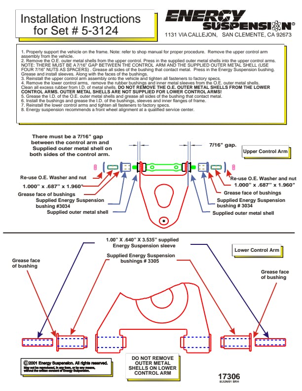 For both front and rear of suspensions on cars, trucks and SUVs. Made of Energy's Hyper-Flex performance polyurethane for optimum performance and durability. Maintains proper alignment under extreme conditions on the street, track or off-road. Improves vehicle handling, cornering and overall control. Full floating for smoother, efficient operation. Outlasts and outperforms rubber.