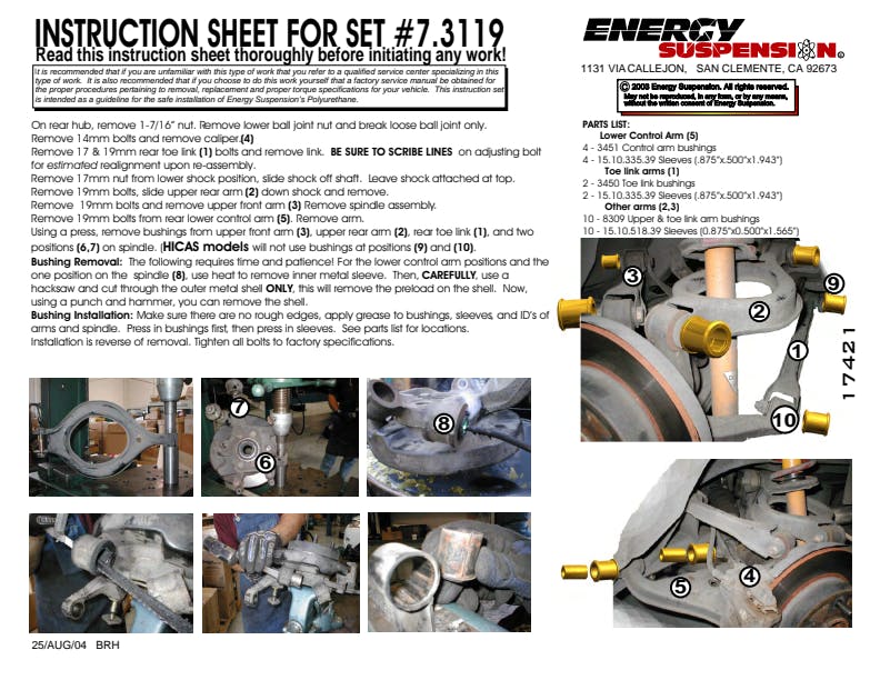 For both front and rear of suspensions on cars, trucks and SUVs. Made of Energy's Hyper-Flex performance polyurethane for optimum performance and durability. Maintains proper alignment under extreme conditions on the street, track or off-road. Improves vehicle handling, cornering and overall control. Full floating for smoother, efficient operation. Outlasts and outperforms rubber.