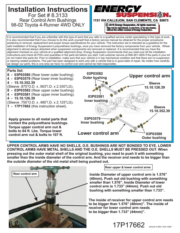 For both front and rear of suspensions on cars, trucks and SUVs. Made of Energy's Hyper-Flex performance polyurethane for optimum performance and durability. Maintains proper alignment under extreme conditions on the street, track or off-road. Improves vehicle handling, cornering and overall control. Full floating for smoother, efficient operation. Outlasts and outperforms rubber.